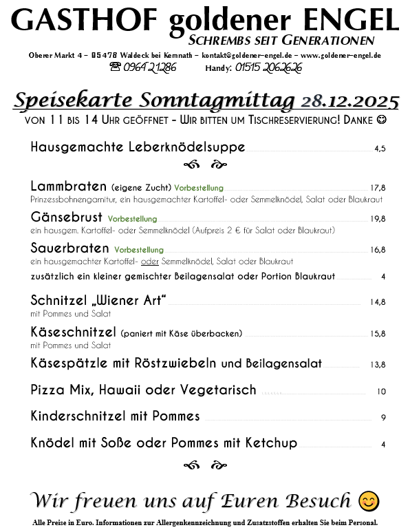 Für euer Wunschgericht bitte bis Freitag vorbestellen.